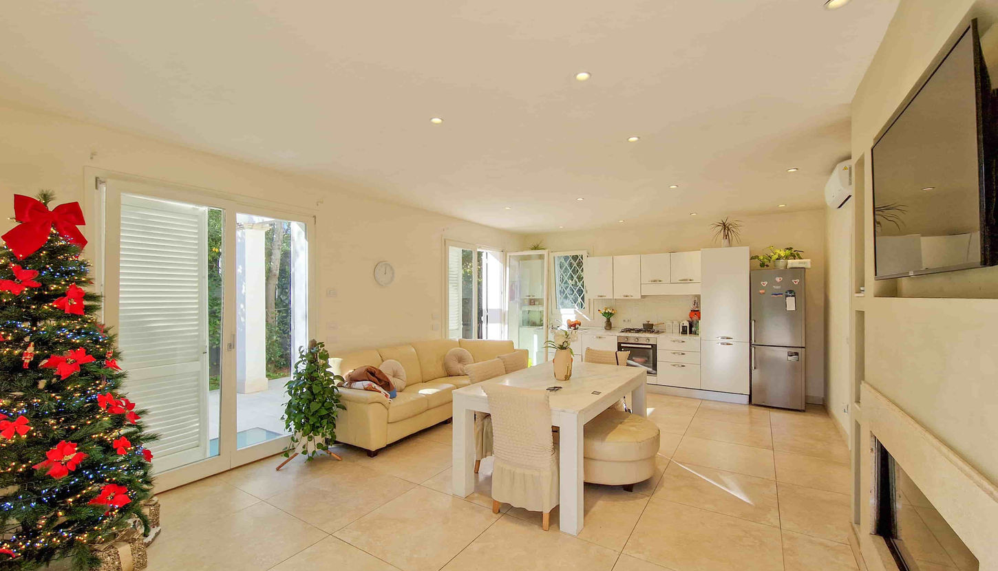 – Soggiorno open-space molto luminoso, con camino, zona pranzo e grandi aperture verso il giardino.