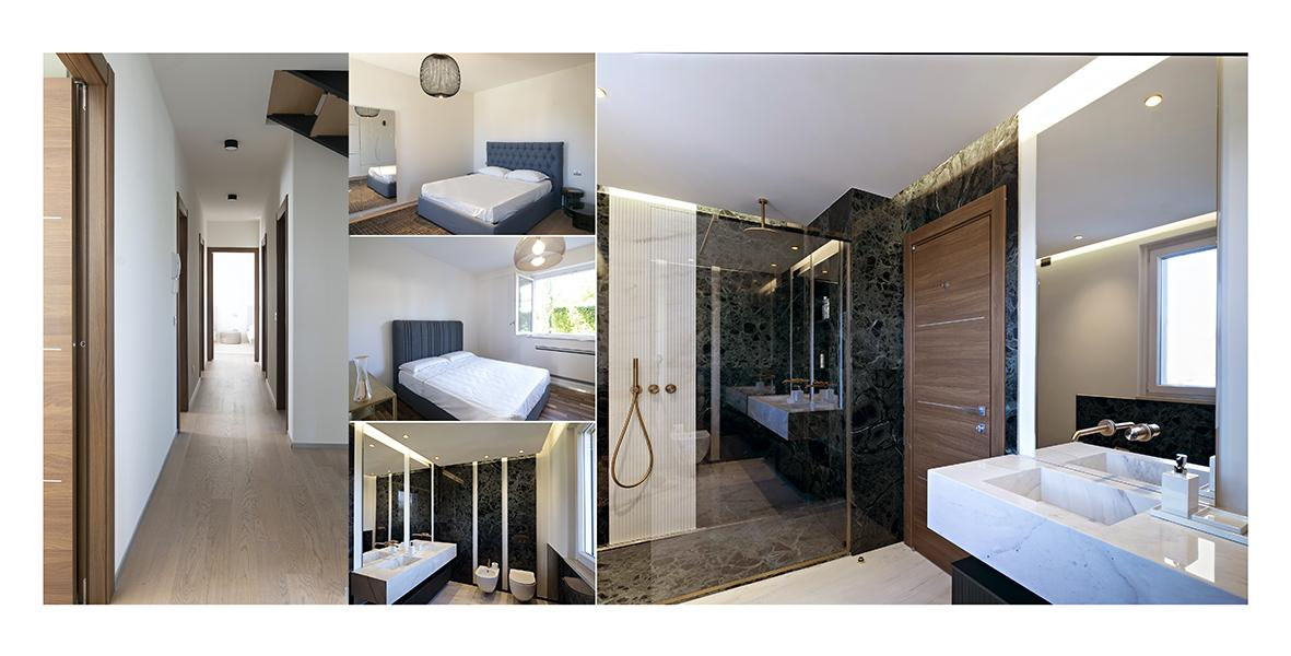 La villa si sviluppa su quattro livelli. Al piano interrato troviamo garage per tre auto, camera di servizio, SPA, taverna e bagno. Il piano terra accoglie un’ampia zona living open space, cucina abitabile, studio, lavanderia e due bagni. Al primo piano si sviluppa la zona notte con suite padronale completa di bagno en-suite, cabina armadio e terrazzo privato, tre camere matrimoniali tutte con terrazzo, ulteriori due bagni e una camera armadi. All’ultimo livello, una mansarda con area studio, camera matrimoniale e bagno.