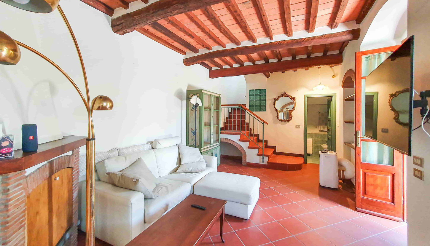 Il piano terra comprende un salone di ingresso con salotto con camino e sala da pranzo, cucina abitabile e un bagno con doccia.