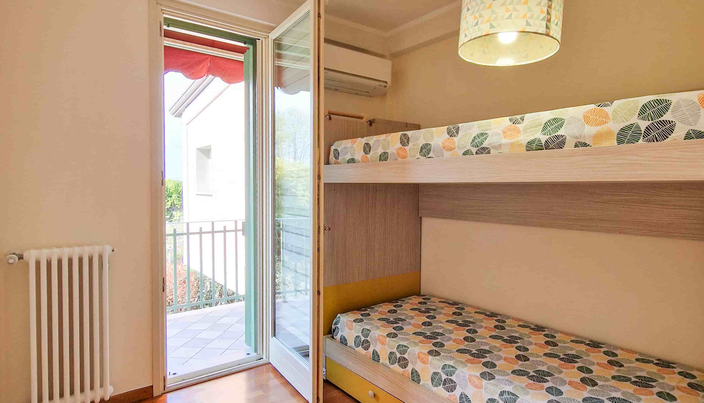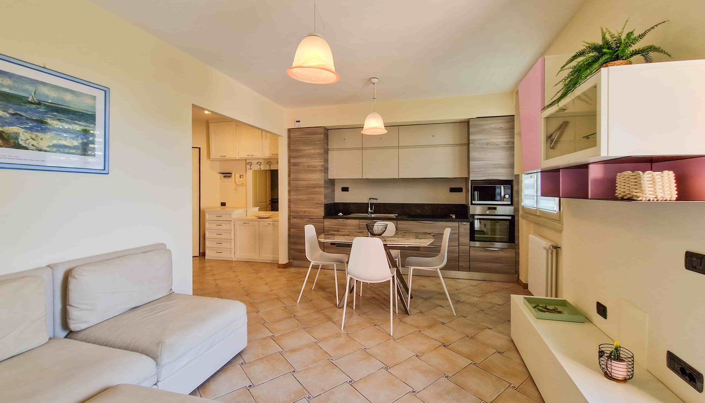 All'ingresso dell'appartamento troviamo un'ampia sala, con appendiabiti, cucina con piano a induzione, tavolo da pranzo estendibile, divano ad angolo ed accesso ad un balcone lato mare, un ampio bagno con doccia e lavatrice, una camera matrimoniale ed una cameretta con due letti a castello dalla quale si accede al balcone.