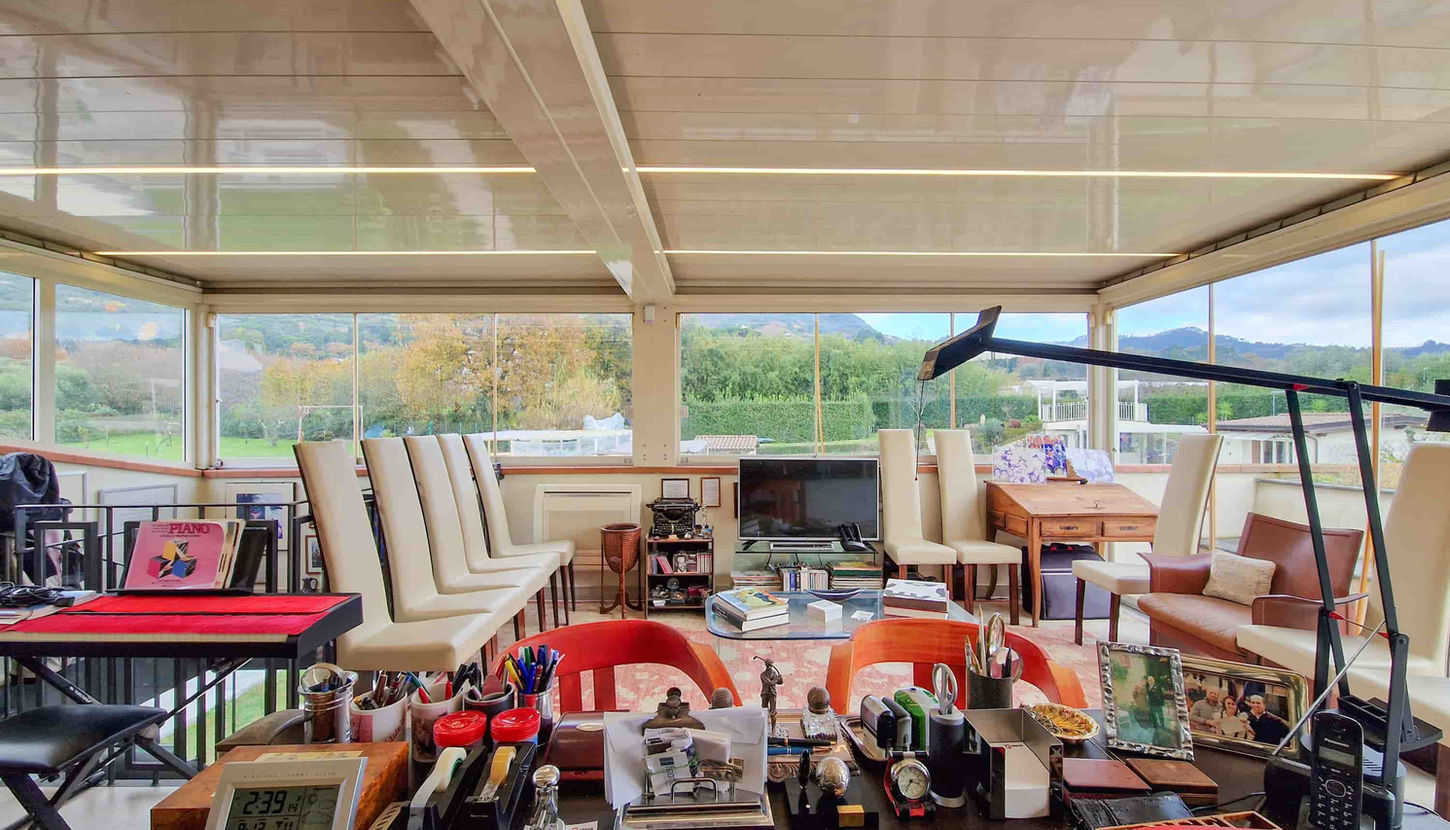 L’ingresso conduce direttamente in una zona giorno ampia e luminosa, pensata come fulcro della casa. La veranda panoramica, completamente integrata con gli ambienti interni, si affaccia sulla piscina a sale e sul giardino, creando una continuità naturale tra interno ed esterno.
